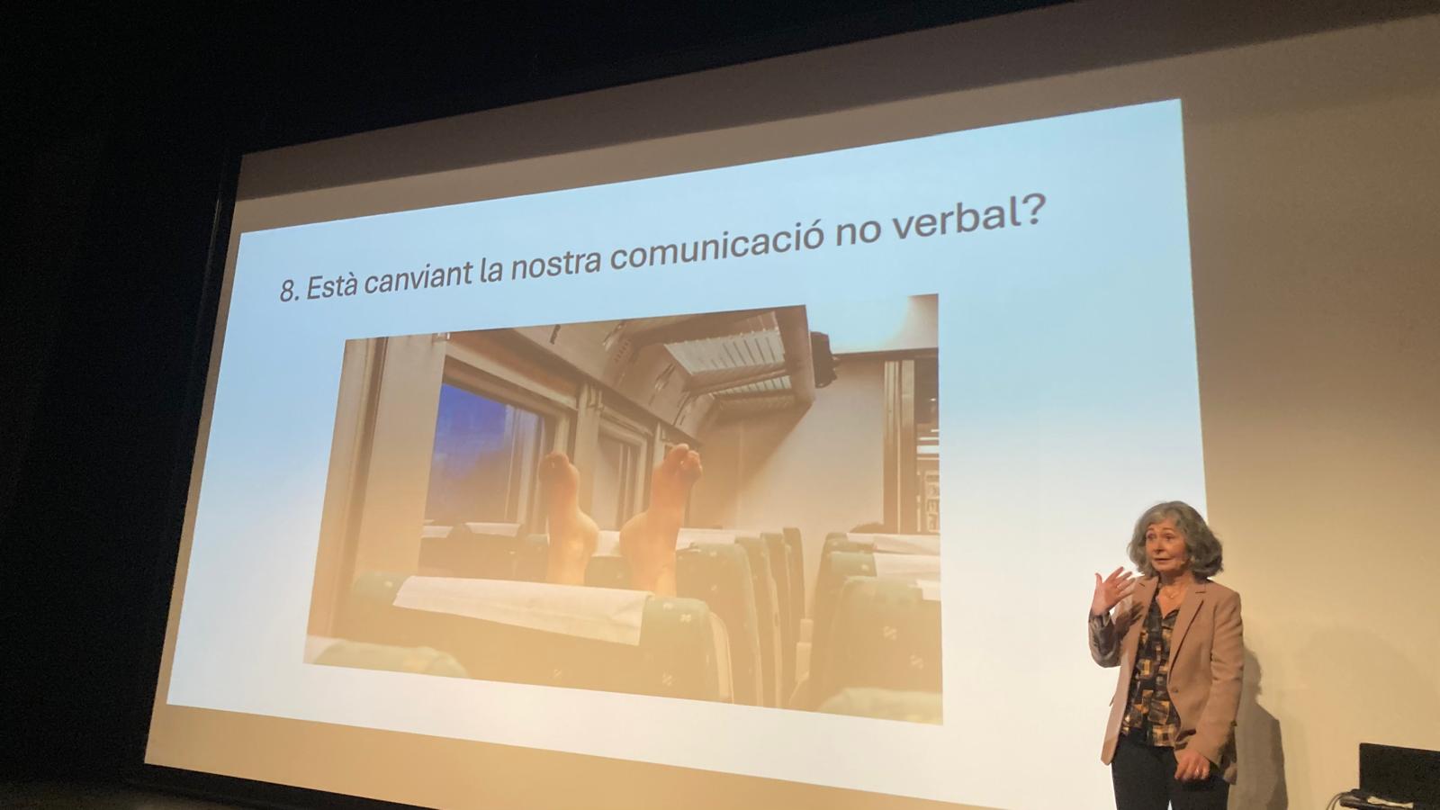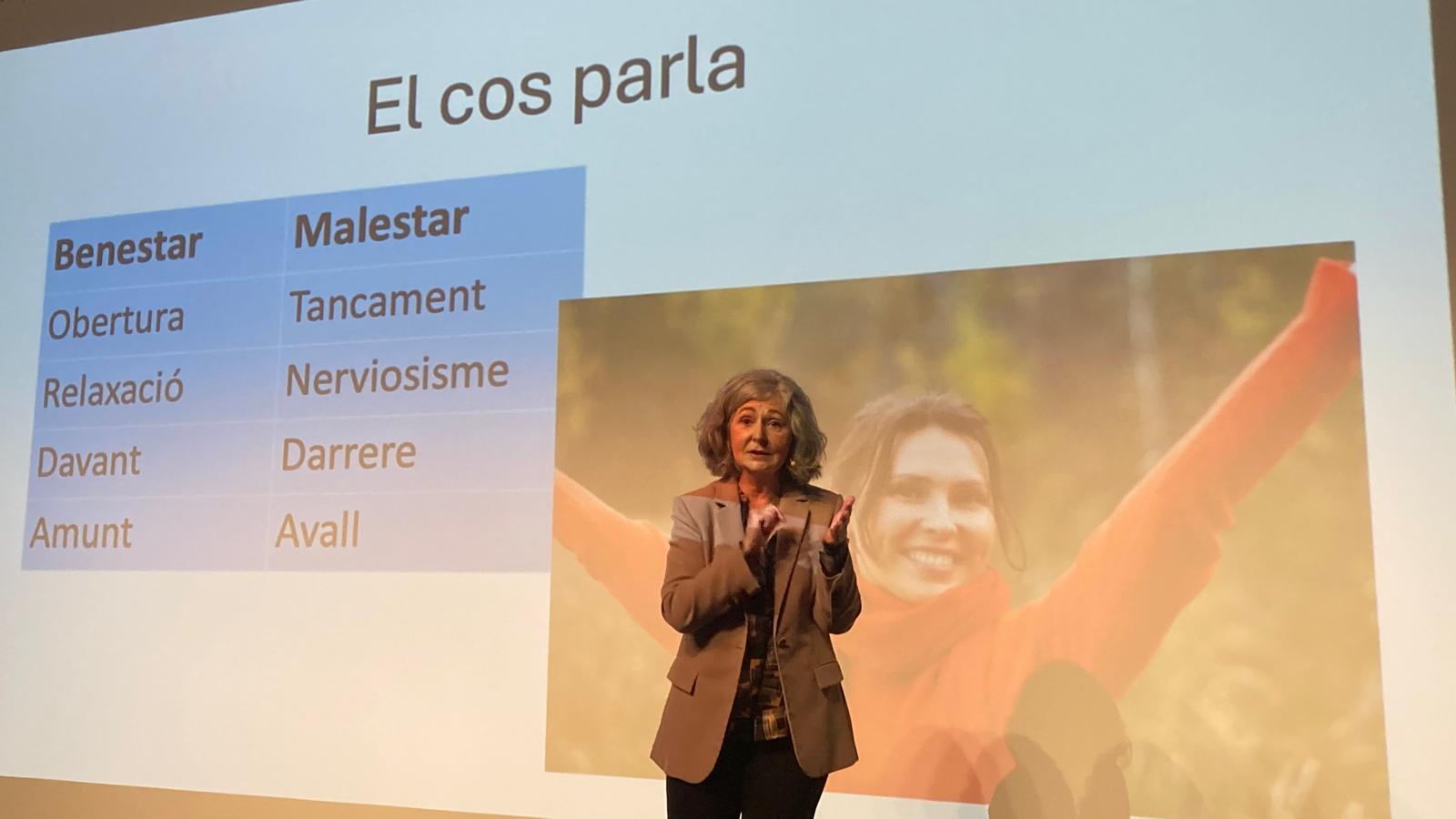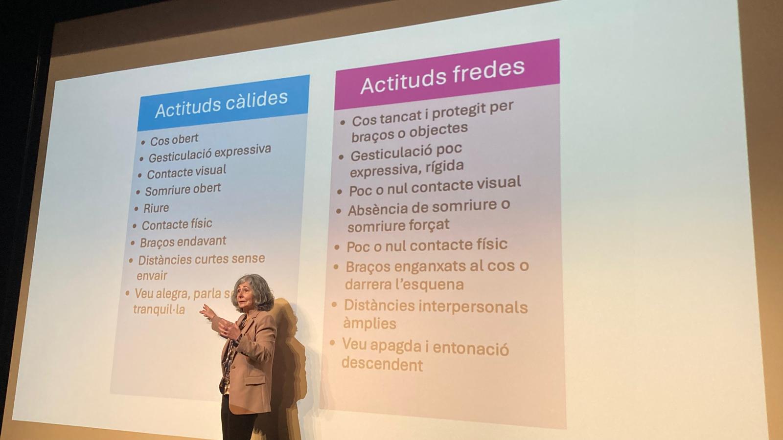 L’experta en comunicació no verbal ha començat la xerrada valorant la importància de tots aquells elements que envolten els actes de parla: la veu, el gest, el contacte, la proximitat, el tempo, l’aspecte, el silenci… Perquè tots aquests elements tenen tant o més impacte que les paraules: “les paraules no germinaran en un terreny que no hàgim preparat”.