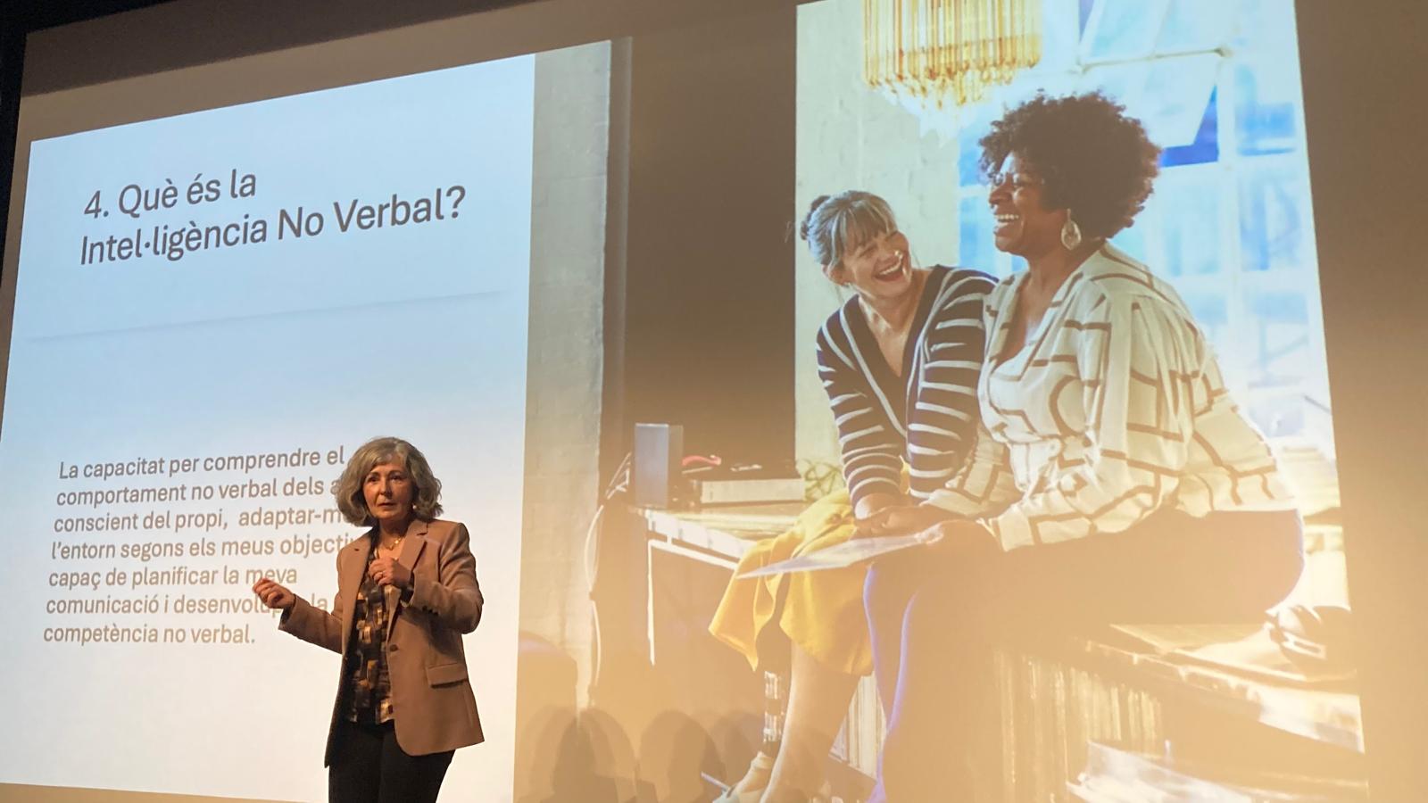 D’una manera molt visual, amb el suport de vídeos i fotografies, la conferenciant ha introduït el concepte d’intel·ligència no verbal, que és l’art de dominar el llenguatge no verbal, previ i simultani al verbal, i omnipresent en la nostra comunicació; o sigui, la capacitat de fer- nos conscients del que comuniquem nosaltres mateixos amb el nostre cos, d’observar l’altre i de connectar-hi per tal d’assolir comunicacions exitoses.
